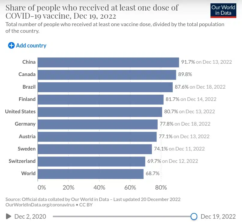 Es wurden bis zum 20. Dezember 2022 in Kanada mehr als 96 Millionen Impfungen gegen das Coronavirus verabreicht, was einer Impfquote von etwa 260 Impfungen je 100 Einwohner entspricht (mind. 89,8%), bei einer Einwohnerzahl von insgesamt 37 Millionen Menschen. Das bedeutet, dass fast alle Einwohner Kanadas mindestens eine Impfung erhalten haben und viele auch vollständig geimpft sind. Die Impfquote für die Booster-Impfung lag bei 79,1 Prozent. [Stand 05.2023]