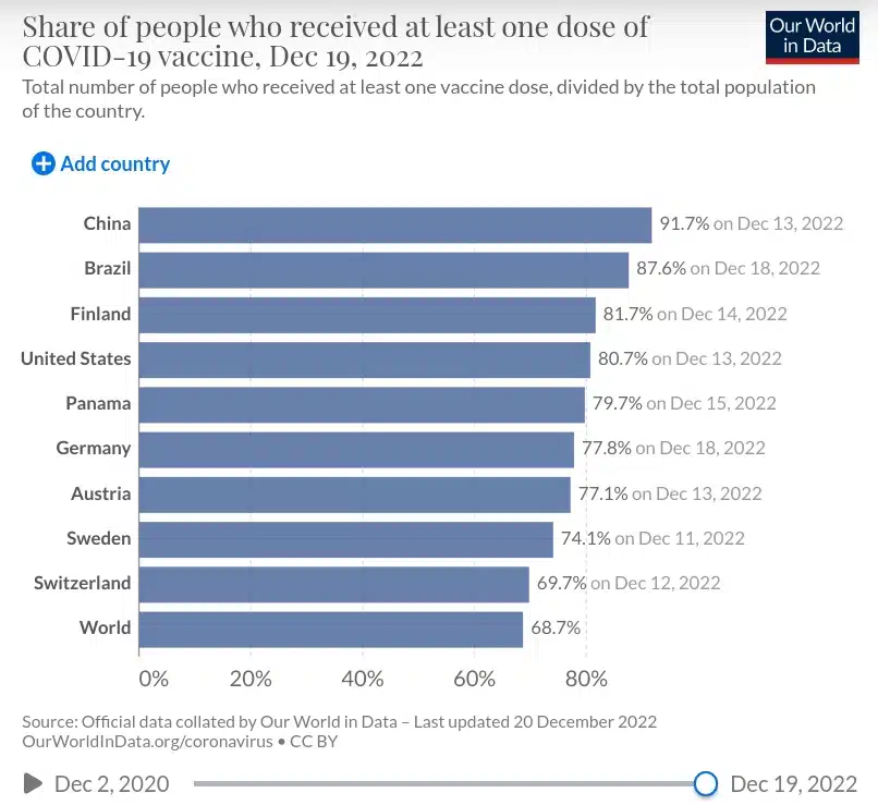 Panama hat bis zum 7. April 2023 insgesamt 8.866.774 Impfdosen verabreicht. Dies entspricht einer Impfquote von 199,13 Dosen pro 100 Einwohner. 80,12% der Bevölkerung haben mindestens eine Dosis eines Covid-Impfstoffs erhalten. Dies ist höher als der globale Durchschnitt von 70% und als die regionalen Durchschnitte von 67% für Nordamerika, 64% für Südamerika, 62% für Europa, 60% für Asien, 37% für Afrika und 36% für Ozeanien. [Stand 05.2023]