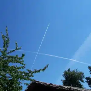 Etwa zwei Wochen später, an einem sonnigen Sommertag im Jahr 2006, mähte ich wie jede Woche den Rasen. Plötzlich blieb ich wie angewurzelt stehen: Am Himmel befanden sich lange, Kondensstreifen, die sich teilweise überkreuzten – und einige ließen sogar vermuten, dass das Flugzeug, das sie ausgebracht haben musste, eine Kurve geflogen war. Ich ließ den Rasenmäher im Garten stehen, rannte ins Haus, schnappte mir meine Digitalkamera und begann, den Himmel zu fotografieren.