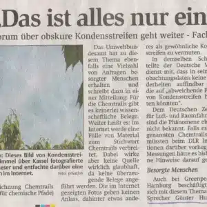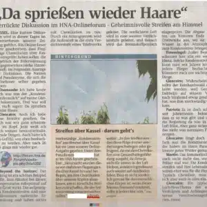 Zwei Tage später, beim Frühstück, fiel ich fast vom Stuhl, als ich die Printausgabe der HNA durchblätterte. Da war ein Artikel mit einem Foto vom Himmel voller Kondensstreifen. Dazu die Schlagzeile: „Verrückte Diskussion im HNA-Onlineforum – Geheimnisvolle Streifen am Himmel“.