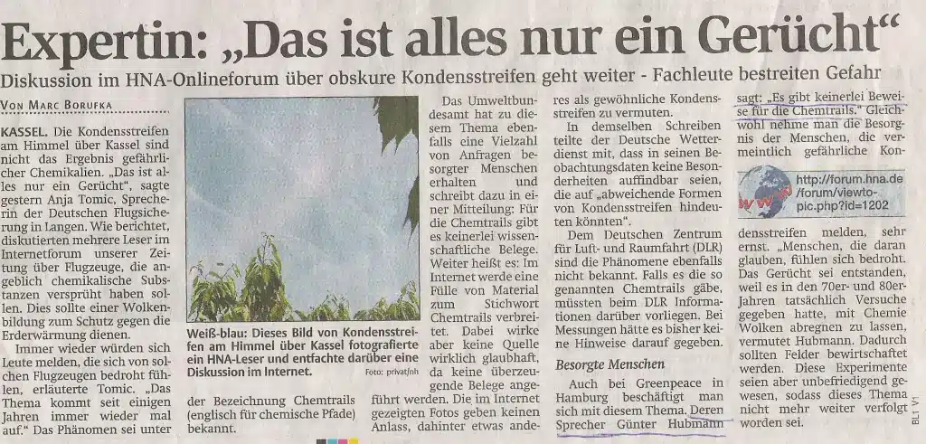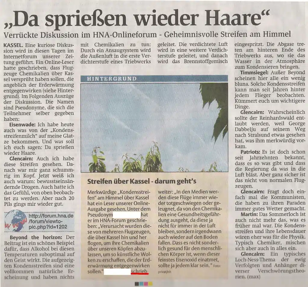 Zwei Tage später, beim Frühstück, fiel ich fast vom Stuhl, als ich die Printausgabe der HNA durchblätterte. Da war ein Artikel mit einem Foto vom Himmel voller Kondensstreifen. Dazu die Schlagzeile: „Verrückte Diskussion im HNA-Onlineforum – Geheimnisvolle Streifen am Himmel“.